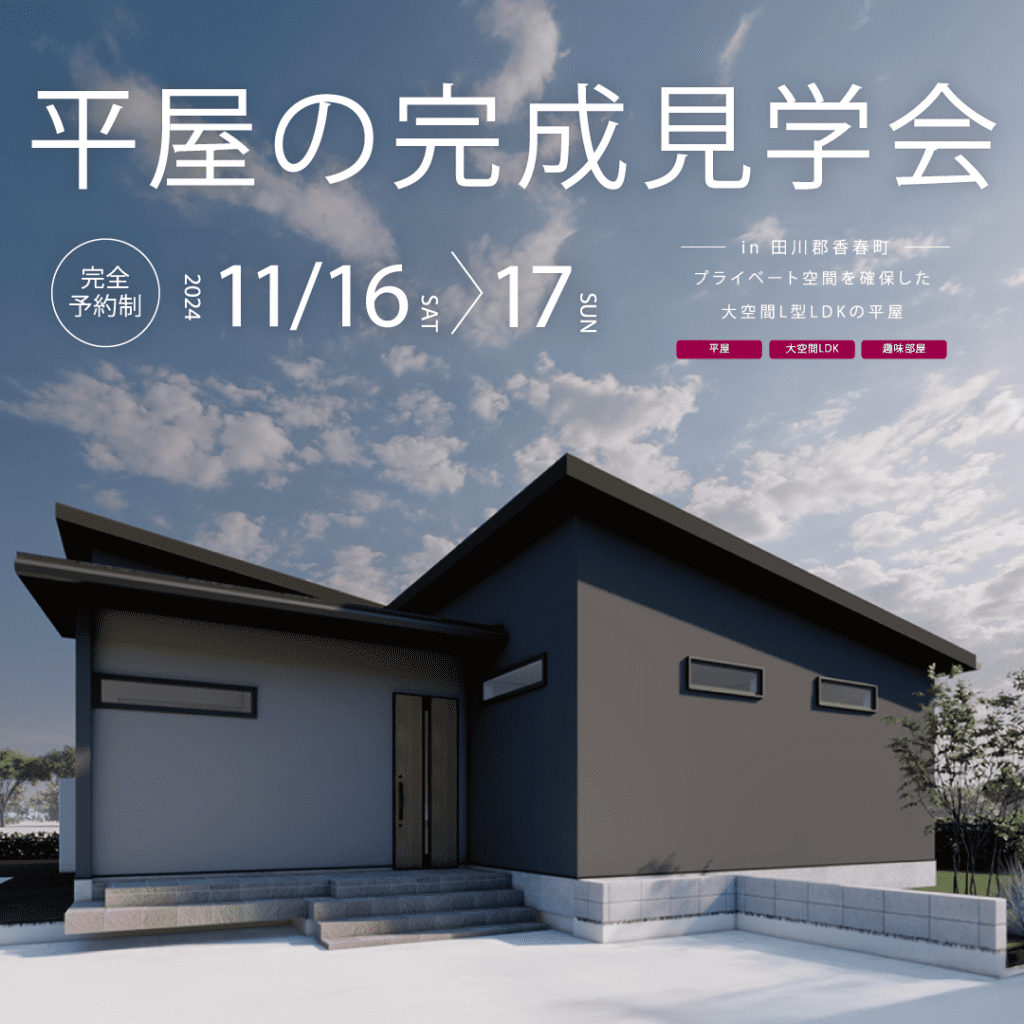 この度、お施主様のご厚意により田川郡香春町にて「平屋の新築完成見学会」を開催することとなりました!