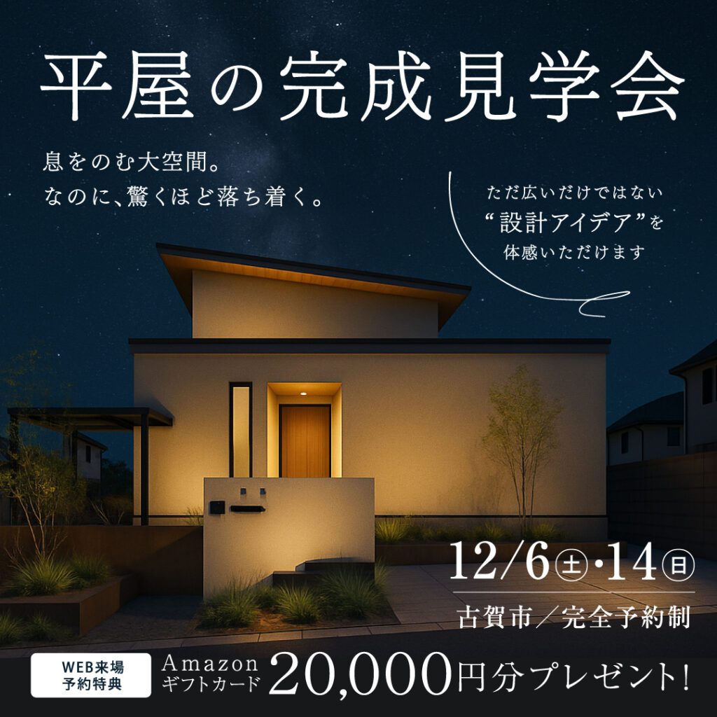 この度、お施主様のご厚意により古賀市にて「平屋の完成見学会」を開催することとなりました!