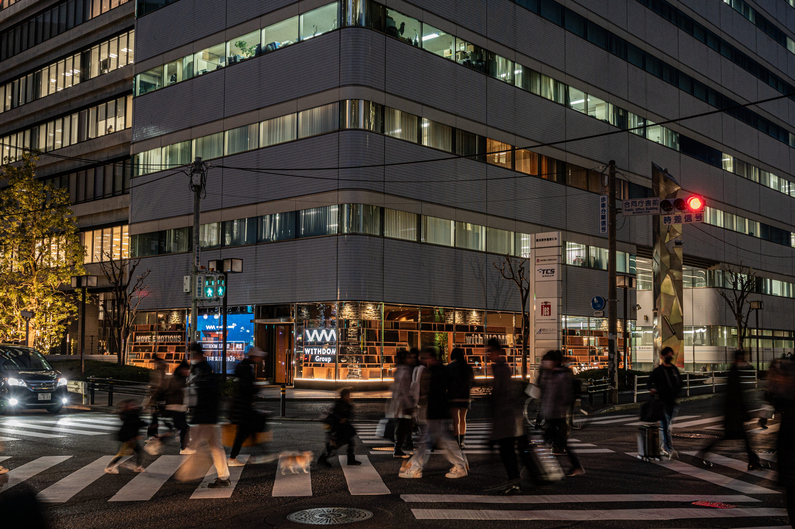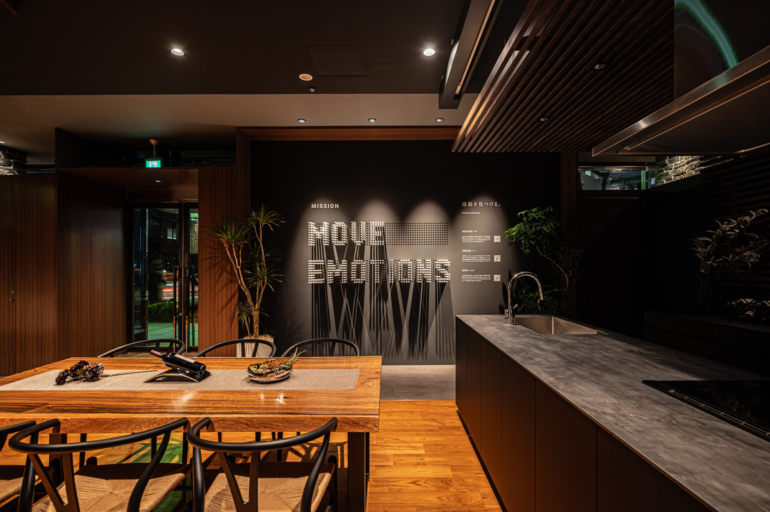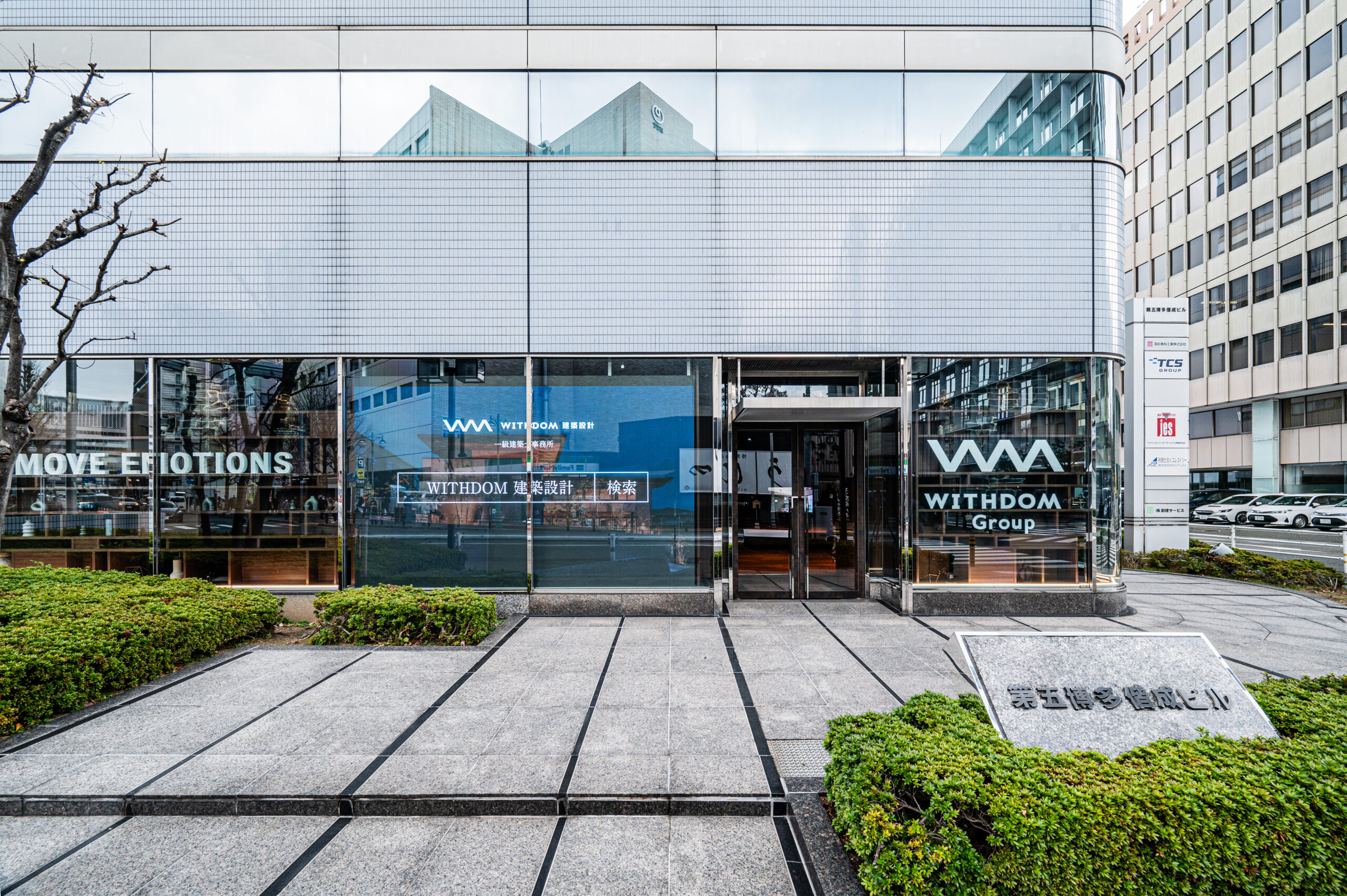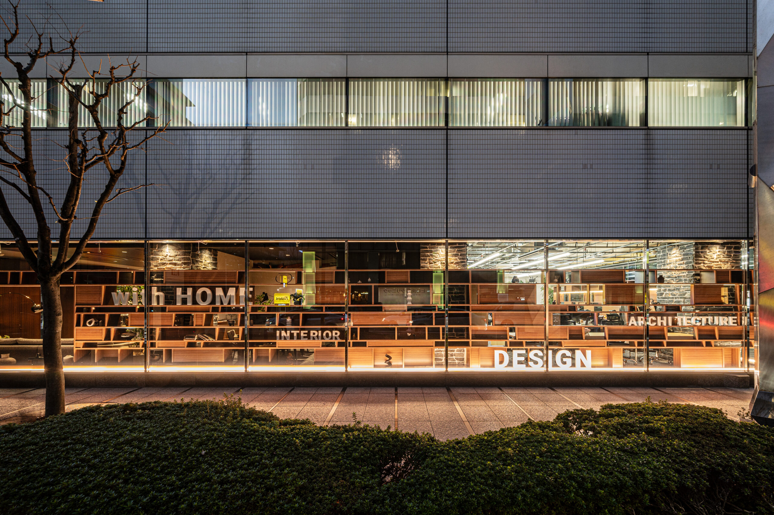 書棚に見立てた外観は、WITHDOM建築設計を象徴するサインやライティングを施しました。