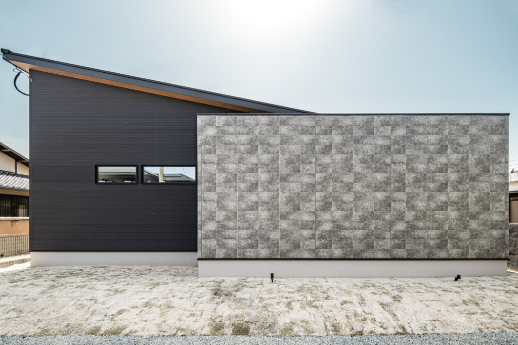 ストーン調と木目調の異なる素材を組み合わせで、モダンで落ち着いた雰囲気の外観。